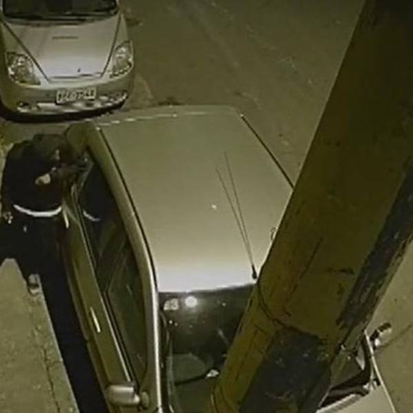 En una grabación se observa cómo un hombre ronda un carro. Con un objeto trata de vulnerar las seguridades, pero no puede abrir la puerta.