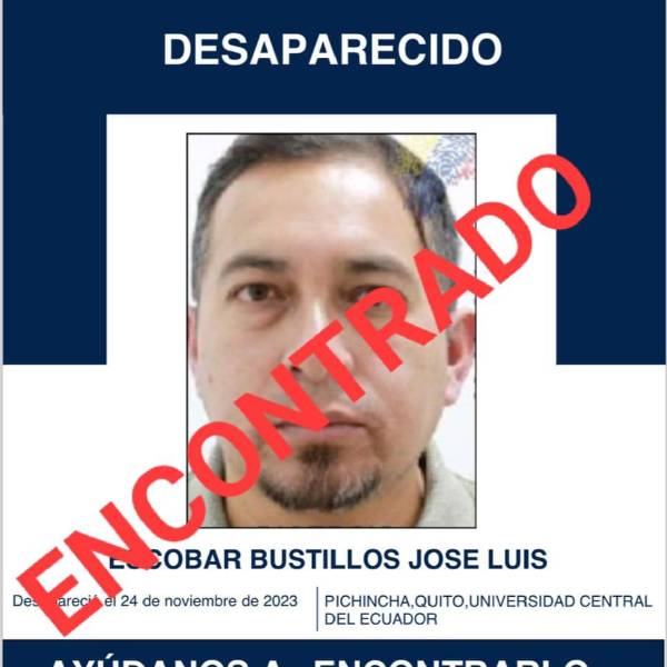 José Luis Escobar Bustillos, un trabajador de la Universidad Central del Ecuador (UCE), fue localizado con vida después de que se reportara su desaparición el viernes 24 de noviembre. El hombre fue visto por última vez en las instalaciones del centro educativo, en Quito.