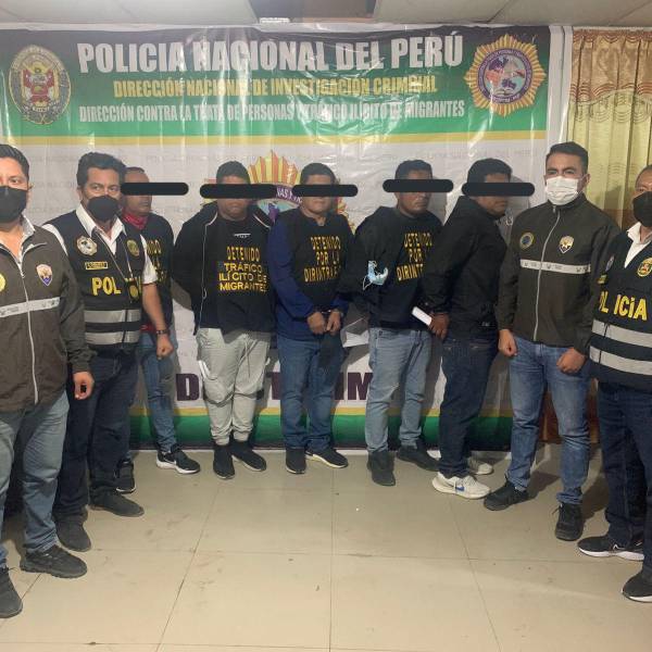 En la gráfica aparecen también policías de Ecuador y Perú, junto a una gran pancarta que reza: "Policía Nacional del Perú, dirección nacional de investigación criminal, Dirección contra la trata de personas y tráfico ilícito de migrantes".