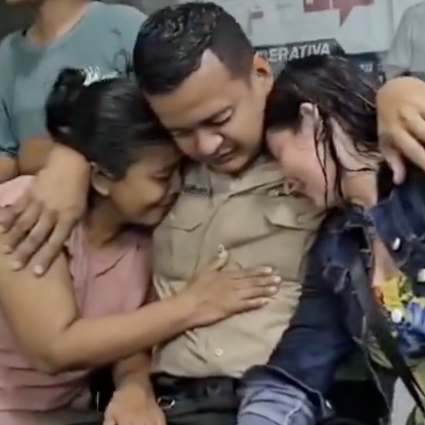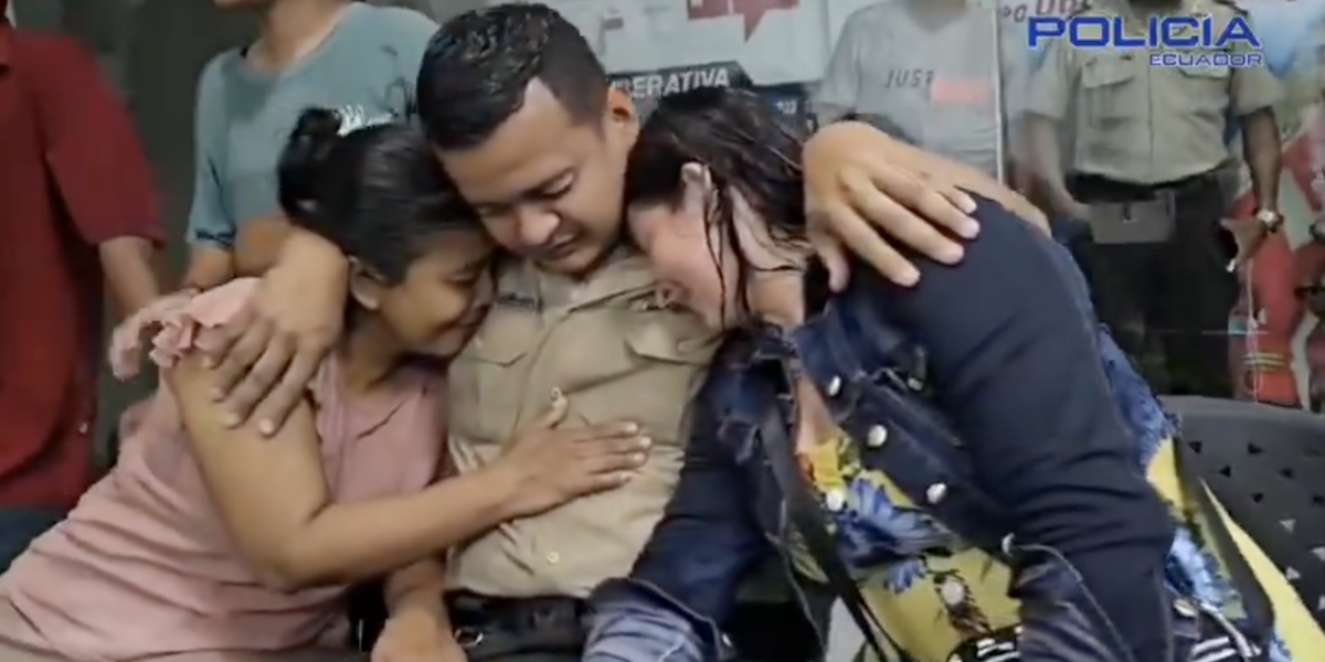 Un policía abraza a su familia tras ser rescatado en Quevedo. ( )