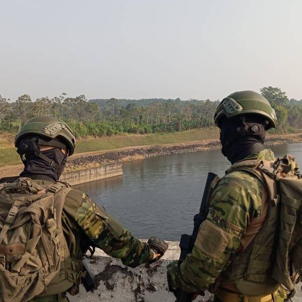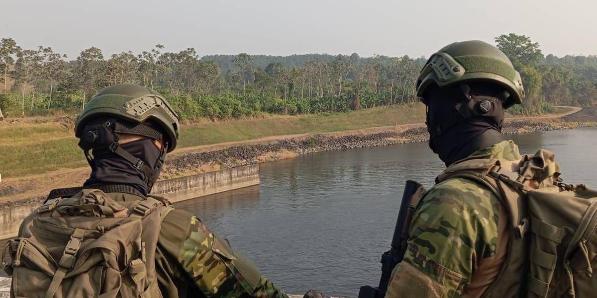 Imagen de dos militares patrullando la represa de Baba del cantón Buena Fe, en la provincia de Los Ríos, para prevenir ataques terroristas, en septiembre de 2024.( )