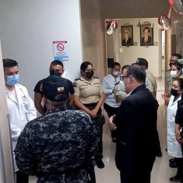 El ministro del Interior, Juan Zapata (d), y el comandante de la Policía, Fausto Salinas, visitaron el hospital donde está ingresada Verónica Songor.