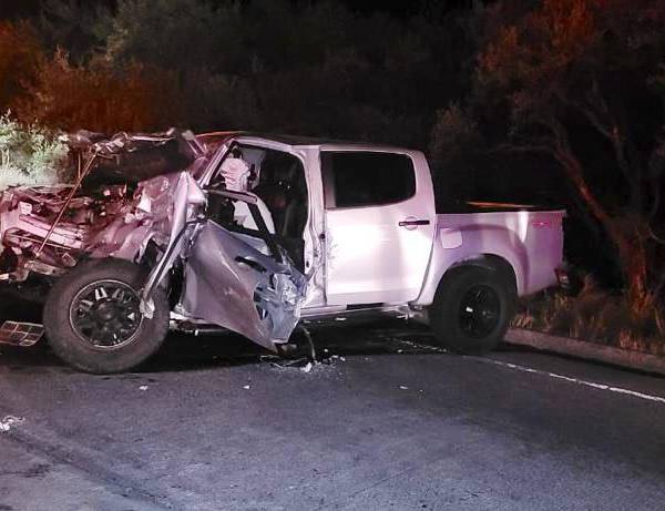 Una camioneta doble cabina se impactó contra un tráiler pasadas las 23:00. La parte frontal del primer vehículo quedó destruida, mientras que el camión quedó a un costado de la carretera, frente a unas rocas que detuvieron su marcha.