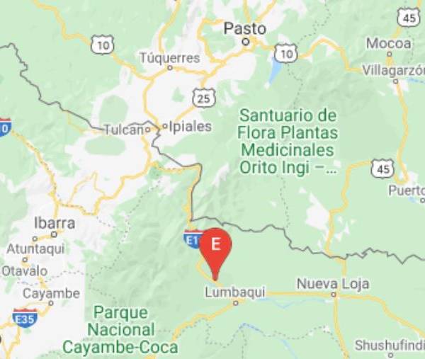 Según el Instituto Geofísico de la Escuela Politécnica Nacional, el sismo ocurrió a las 04:38 hora local (09:38 GMT) a 2,41 grados de latitud sur y a 77,55 grados de longitud oeste.