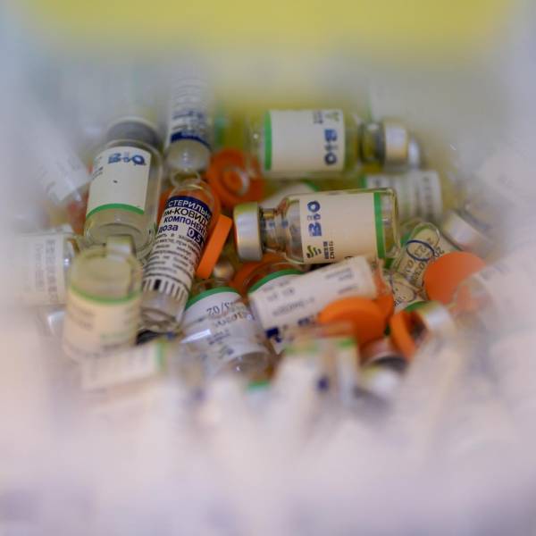 Frascos vacíos de las vacunas rusa Sputnik V y la china Sinopharm contra el COVID-19 llenan un contenedor en el Parque Tecnopolis que ha sido reutilizado como centro de inmunización, en Buenos Aires, Argentina, el jueves 15 de abril de 2021. (AP Foto/Víctor R . Caivano)( )