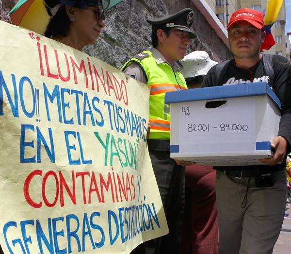 El colectivo Yasunidos, que recogió firmas en favor de una consulta popular sobre la anunciada explotación petrolera en una zona de la Amazonía ecuatoriana de alta biodiversidad, presentó hoy miles de rúbricas a la autoridad electoral para la revisión correspondiente.