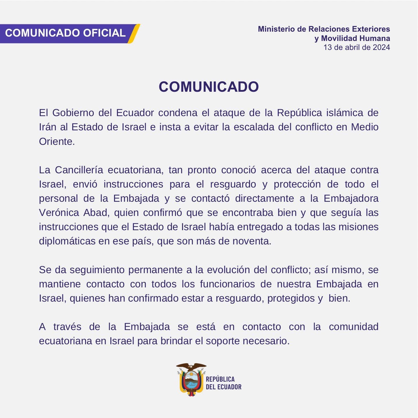 Sin embargo, pasadas las 22:30, el Ministerio de Relaciones Exteriores publicó otro mensaje, en el que señala que el Gobierno del Ecuador condena el ataque de la República islámica de Irán al Estado de Israel, y que insta a evitar la escalada del conflicto en Medio Oriente.