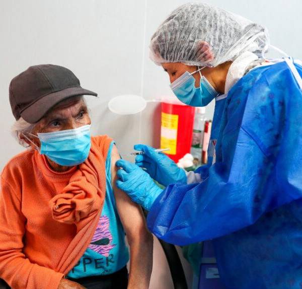Una adulta mayor es vacunada el 25 de marzo de 2021 contra la covid-19, en el Hospital Luz Elena Arismendi de Quito (Ecuador). EFE/José Jácome( )