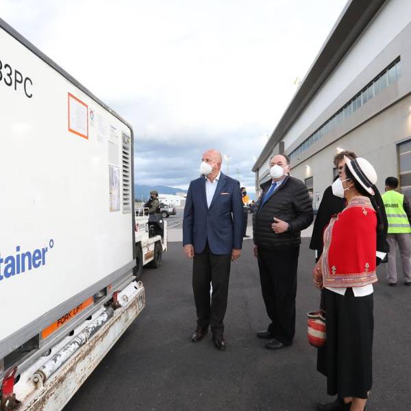 El encargado de recibir el lote fue Martín Cabezas, secretario general de la vicepresidencia de la República, quien junto al viceministro de Gobernanza y Vigilancia de la Salud, José Ruales, receptaron las 3 millones de dosis de la vacuna asiática.