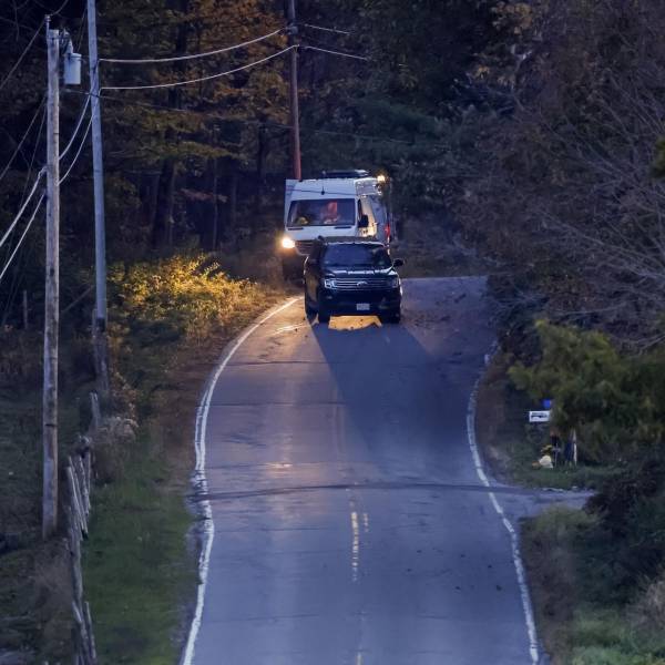 Vehículos policiales transitan cerca de la casa de Robert Card, sospechoso de los tiroteos masivos en Maine (EE.UU.)( )