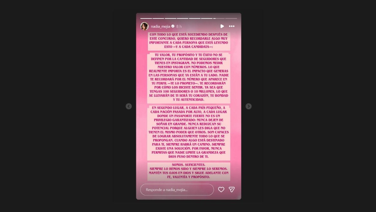 Posteriormente, en un en vivo en Instagram, Nadia Mejía insinuó que tiene mucho más que decir sobre su experiencia en el Miss Universo 2025, sugiriendo que las controversias van más allá de lo que se ha hecho público: