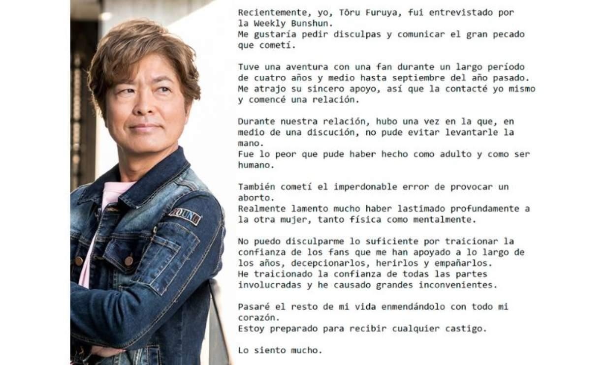 La revista Shūkan Bunshun publicó el testimonio de una mujer de 33 años, quien reveló haber estado en una relación extramatrimonial con Furuya, de 70 años, hasta septiembre de 2023. Sin embargo, la parte más impactante llega cuando la mujer confiesa que, fruto de esta relación, terminó embarazada y se vio forzada a abortar. El artista se pronunció sobre las declaraciones en su cuenta de X.