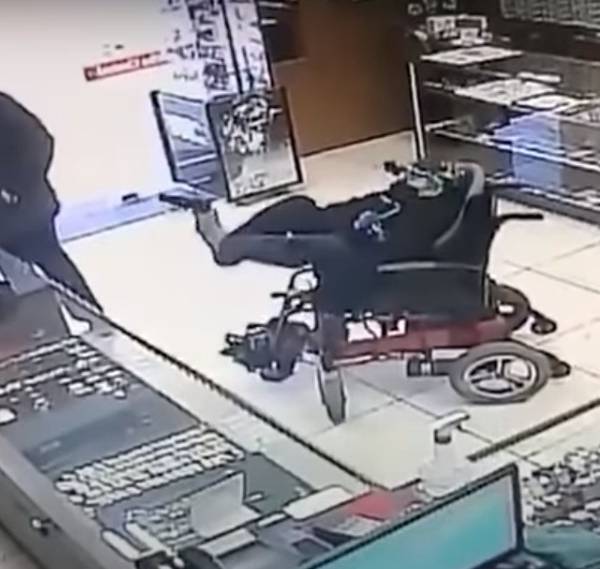 El atracador muestra cierta destreza apuntando el arma con sus pies mientras se mueve con la ayuda de la silla de ruedas en la que se desplaza.