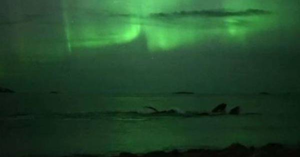 Un grupo de ballenas jorobadas retozando bajo el espectáculo de la aurora boreal fueron grabadas por la televisión noruega.