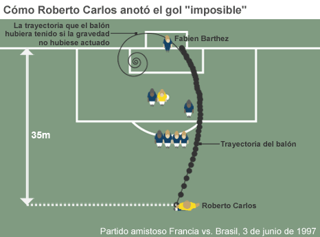 Los físicos han encontrado la explicación a uno de los goles más espectaculares de la historia del fútbol. El tiro libre del brasileño Roberto Carlos en un partido contra Francia tomó una curvatura tan pronunciada y desconcertante que el golero Fabián Barthez quedó como paralizado en la línea de meta. Ahora un estudio que aparece en el New Journal of Physics (o Revista de Física) sugiere que la hazaña no fue un accidente futbolístico, como muchos aficionados creen. Véalo en YouTube Un equipo de científicos franceses descubrió la trayectoria de la pelota y desarrolló una ecuación que la describe. Según ellos, el gol podría repetirse si la pelota recibiera un golpe lo suficientemente fuerte, gira sobre sí misma y -lo más importante- a una distancia suficiente del arco. Roberto Carlos marcó su gol "mágico" en 1997, en un encuentro que formó parte del Tournoi de France, un torneo amistoso que se celebró como antesala al Mundial de Fútbol de 1998. Toma la curva Si las condiciones están dadas, el "hechizo" de Roberto Carlos podría repetirse, dice el estudio. Algunos comentaristas lo bautizaron como "el gol que desafió a la física", pero el estudio presenta la ecuación que describe la trayectoria de la pelota con exactitud, y prueba lo contrario. "Hemos mostrado que el rumbo de una esfera que gira sobre sí misma es una espiral", dijo a la BBC el director de la investigación, Christophe Clanet, de la École Polytechnique (Escuela Politécnica) de París. Clanet describió la trayectoria como "un rulo de caracol", ya que aumenta la curvatura a medida que la pelota gana distancia. Gracias a que Roberto Carlos se encontraba a 35 metros de la meta cuando pateó la pelota, la curvatura pudo apreciarse mejor. De forma que el tiro "desafiante" al fin y al cabo siguió una curva que cada vez se cierra más sobre sí misma. Clanet estaba investigando la trayectoria de las balas junto a su colega David Quere, cuando derribaron este mito futbolístico. Para "simplificar el problema" se valieron de pelotas de plástico que tuvieran la misma densidad que el agua. Un viaje largo Simular el tiro libre bajo el agua permitió eliminar los efectos de las turbulencias en el aire y la fuerza de gravedad, y reveló la trayectoria pura de una esfera giratoria. "En una cancha de fútbol, veremos algo parecido a esta espiral ideal, pero se notará la influencia de la gravedad", explicó Clanet. "Sin embargo, con un golpe lo suficientemente fuerte, como el de Roberto Carlos, ésta influencia se minimiza", agregó. El secreto clave, de todas formas, según los científicos, fue la distancia que recorrió la pelota para lograr engañar a Barthez. "Si la distancia no es suficiente, sólo puede verse la primera parte de la curva", explicó Clanet. "Pero si la distancia es la correcta, como en el tiro de Roberto Carlos, la curva se cierra, y se ve la trayectoria completa", remató.