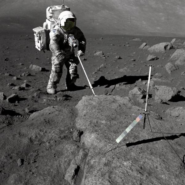 El astronauta del Apolo 17 Harrison Schmitt en 1972, cubierto de polvo lunar. ( )