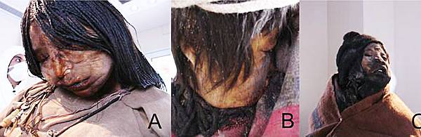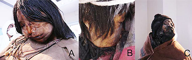 Los niños de Llullallaico. a) La Doncella; b) El Niño y c) La Niña. Foto: gentileza Angelique Corthals, Antonius Koller, Dwight W. Martin, Robert Rieger, Emily I. Chen, Mario Bernaski, Gabriella Recagno, Liliana M. Dávalos.