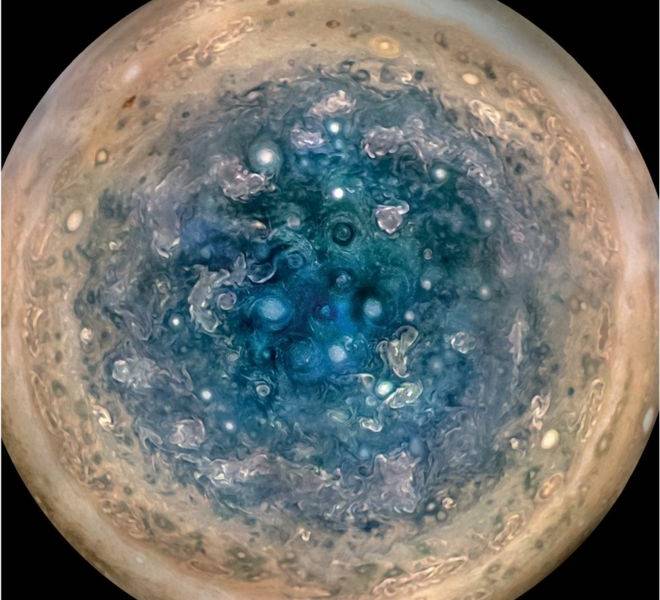 Los ciclones gigantescos que cubren las latitudes más altas del planeta pudieron ser ahora observados en detalle, ya que las misiones anteriores nunca pudieron ver al planeta desde arriba y desde abajo tal y como lo logró Juno, y tampoco habían tomado imágenes en un resolución tan alta.