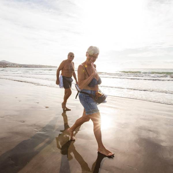 En la imagen de archivo, un hombre y una mujer pasean por la orilla de la Playa del Inglés, en Gran Canaria, España.( )