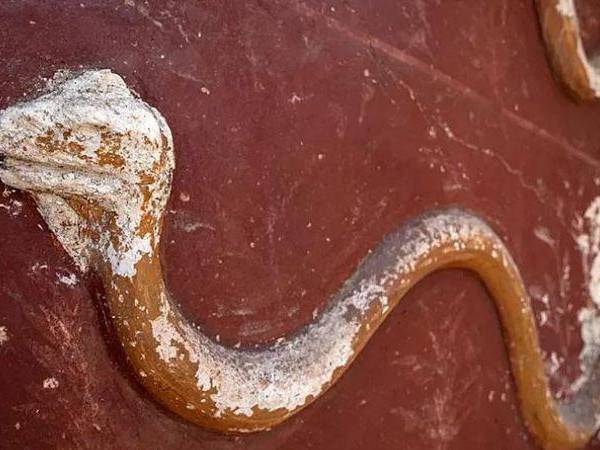En otra habitación hay un altar magnífico. Dos serpientes amarillas en relieve se deslizan sobre un fondo de color bordeaux o burdeos. "Estos son demonios buenos", dice Alessandro y señala un fresco más abajo en la pared, justo encima de la abertura de un tipo de caja.