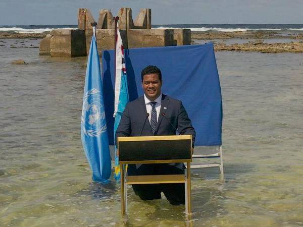 Simon Kofe (en el centro en la imagen), señaló que su país busca vías alternativas en el derecho internacional para obtener compensación.