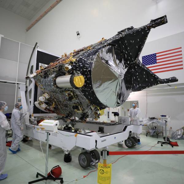 Fotografía de finales de julio cedida por la NASA donde aparecen unos miembros del equipo de la misión Psyche mientras preparan la nave espacial en una instalación cerca del Centro Espacial Kennedy de la NASA, en Florida. EFE/NASA( )