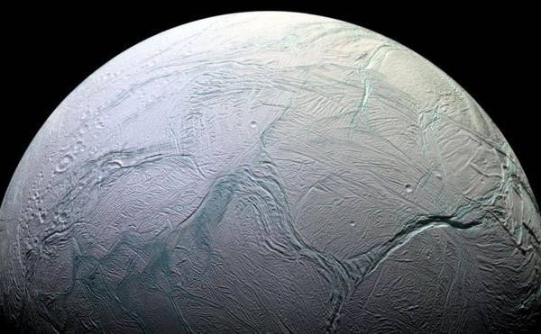 La superficie de Encélado está cubierta de hielo.