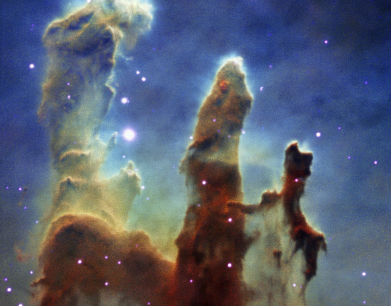 Las columnas surgen cuando las inmensas estrellas de colores blanco y azul de tipo O y B (calientes y muy luminosas) "emiten una intensa radiación ultravioleta y vientos estelares" que desplazan los materiales menos densos, expulsándolos del bloque.