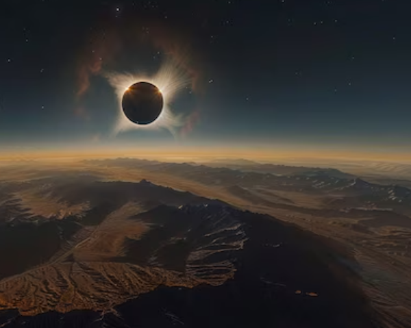 Total: La alineación entre el Sol, la Luna y la Tierra es perfecta, permitiendo que la Luna bloquee completamente la luz solar, haciendo visible la corona solar en un impresionante espectáculo natural.