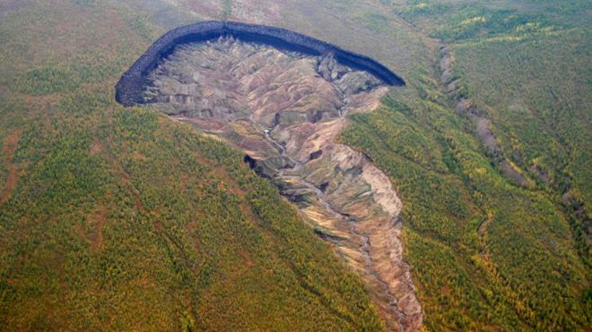 El derretimiento del permafrost ha dejado al descubierto al cráter de Batagaika. La pared del cráter ha crecido un promedio de 10 metros al año. Pero en años de mayor temperatura el incremento ha sido de hasta 30 metros.