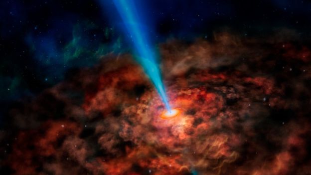 Además, el gas y el polvo que atrae la gravedad del agujero genera una fricciónque los calienta a miles de millones de grados, produciendo gran cantidad de radiación, fugas de energía y partículas cargadas.