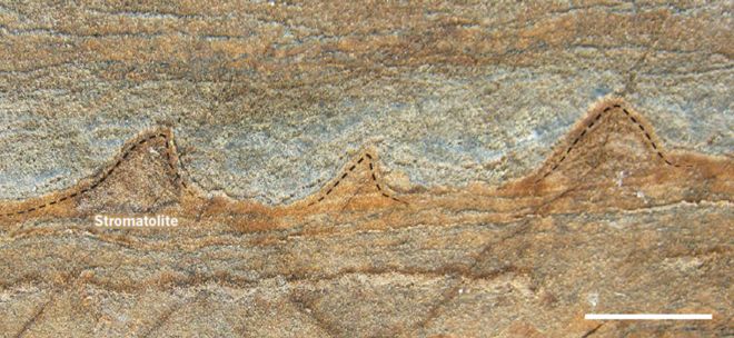 "Nosotros vemos las capas inalterada de sedimento originales, y podemos ver cómo los estromatolitos crecieron a través de las capas sedimentarias, y podemos ver la cúpula y cono característico que forman los estromatolitos modernos".