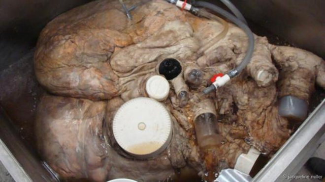 No obstante, pesó un total de 180 kilos. Y, para evitar que el tejido continúe descomponiéndose, el equipo de museo tuvo que usar 3.800 libros de formaldehído.