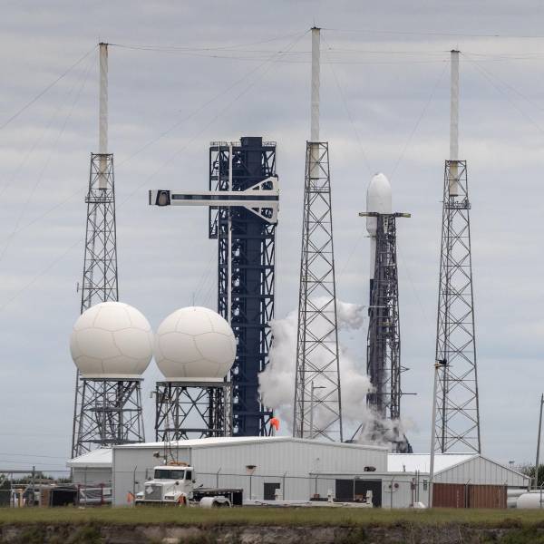 El lanzamiento espacial Delta 45 GSAT-20 sobre un SpaceX Falcon 9 está acoplado en el complejo de lanzamiento espacial 40 en Florida.( )