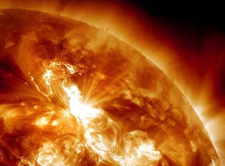 Fotografía de la NASA tomada por el Observatorio de Dinámica Solar (SDO), en la que se observa una erupción solar.( )