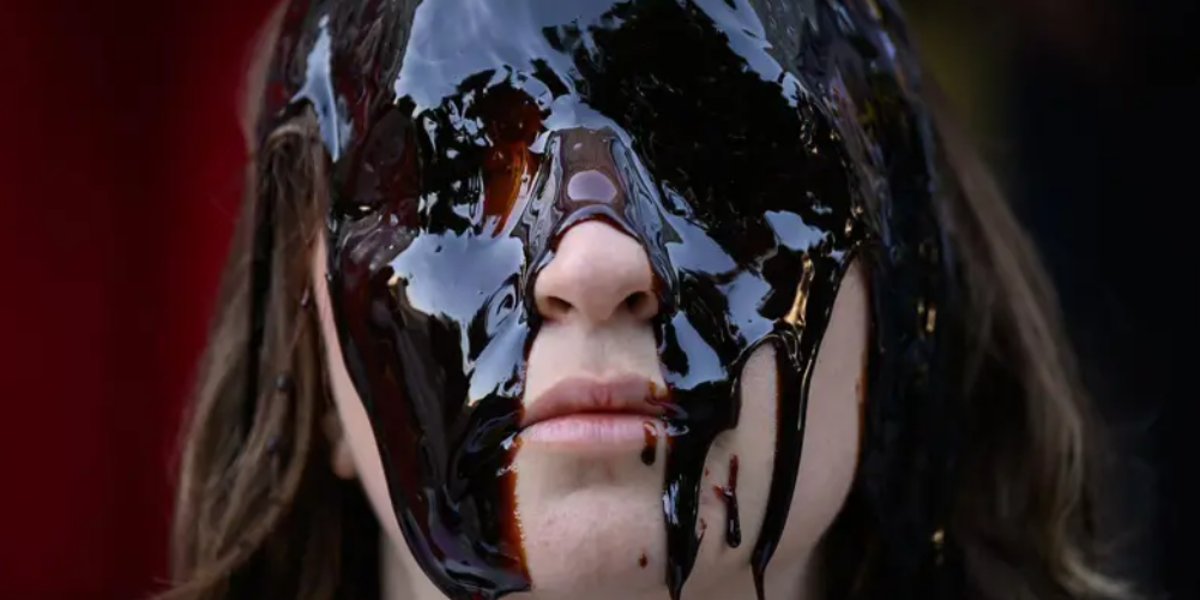 Con la cara cubierta una sustancia aceitosa, una activista del grupo de acción directa Fossil Free London se ubicó frente a las oficinas de la compañía energética Shell en mayo pasado.
