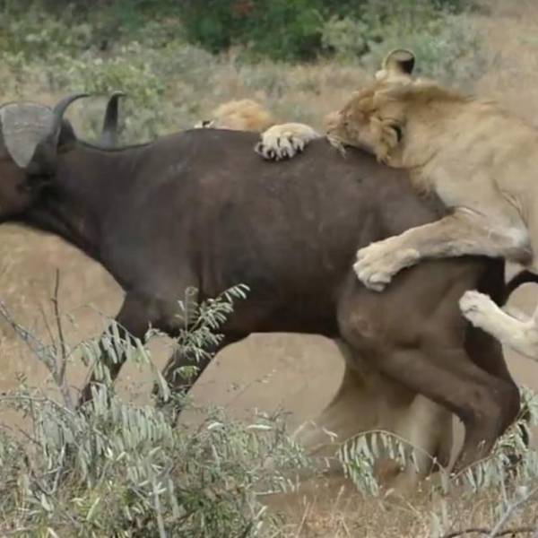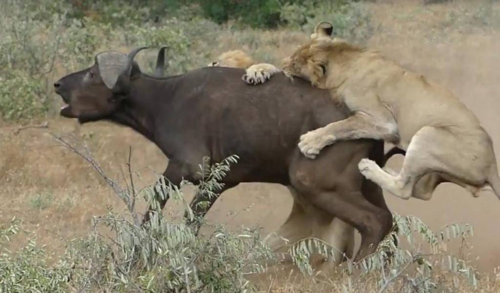 Un video grabado en el parque nacional Kruger, la reserva de caza más grande de Sudáfrica, muestra cómo dos leones atacan a un búfalo.