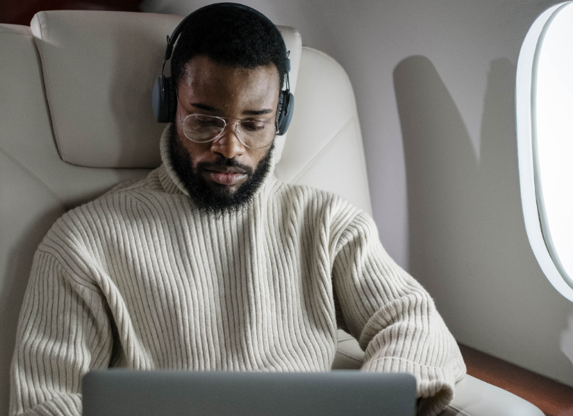 Imagen referencial de hombre trabajando en su laptop mientras viaja en avión. (