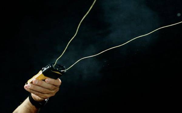 En los extremos de la correa, disparada a 156 metros por segundo, hay dos pequeñas púas que se adhieren a una persona cuando hacen contacto.