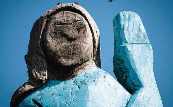 Una estatua irónica de la primera dama estadounidense, Melania Trump, apareció en las afueras de su ciudad natal eslovena.