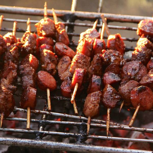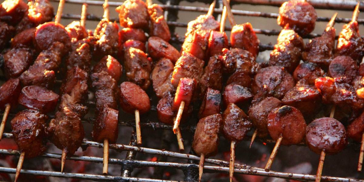 Pinchos de carne y salchichas asadas.( )