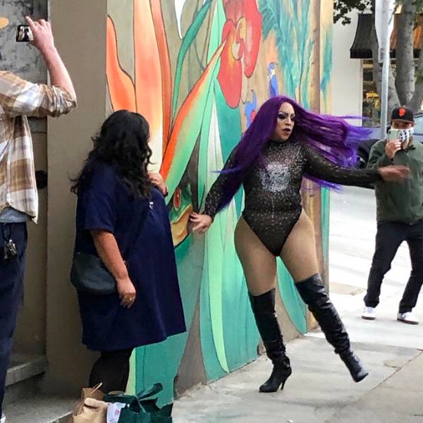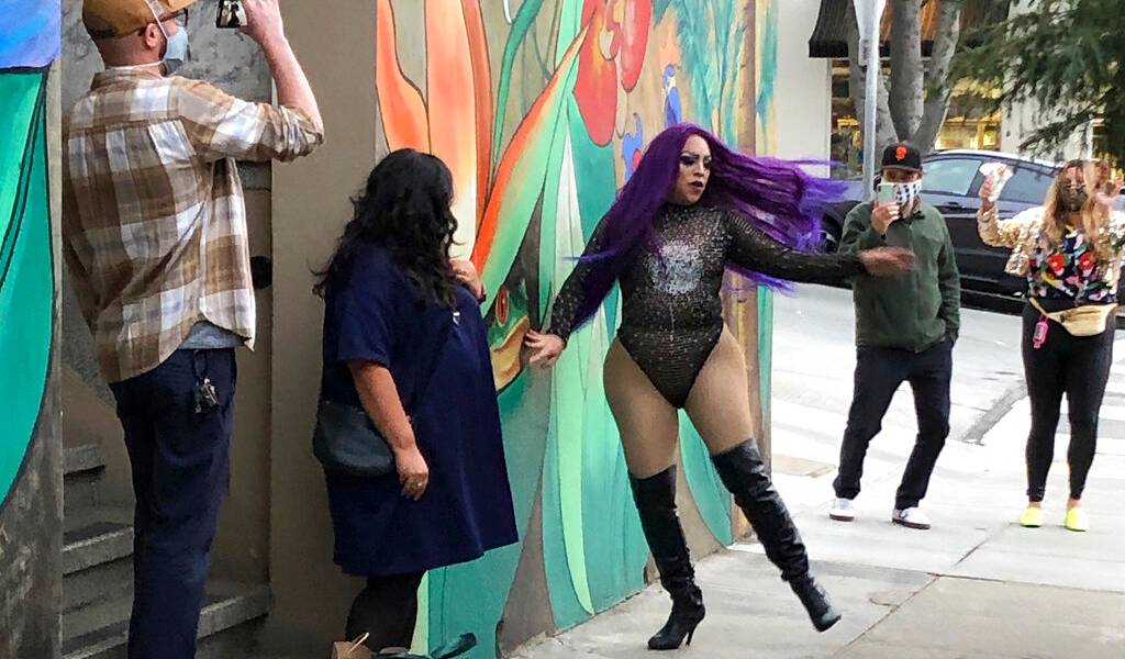 Drag queens con coloridas pelucas, maquillaje elaborado y botas hasta la rodilla con tacón de aguja se ponen un cubrebocas y llevan una bolsa con comida, además de números musicales, hasta las puertas de las casas de sus fans en San Francisco, Estados Unidos.