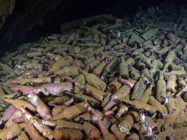 Preservadas en la bodega de este navío, había hileras de botellas de vidrio con cerveza, enterradas parcialmente en el lodo marino.
