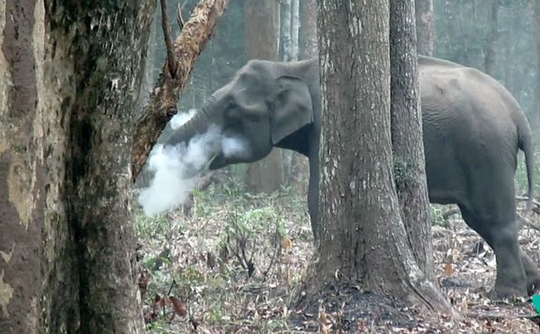 El elefante recoge algo del suelo con su trompa, se lo lleva a la boca y unos instantes después escupe humo como quien fuma un cigarro.