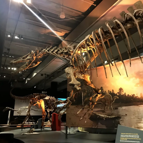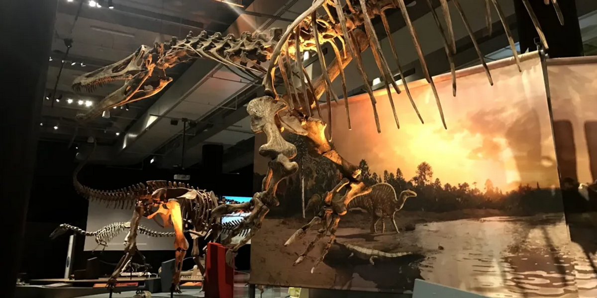 Un esqueleto de un Suchomimus, un espinosaurio del desierto del Sahara, es mostrado en una exposición en Miami.( )