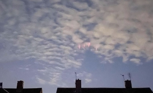 En Reino Unido, los vecinos de un barrio de Leicester salieron de sus casas a la calle para contemplar unas extrañas luces de tonos rojizos que aparecieron flotando sobre sus cabezas, el lunes 6 de julio de 2020.