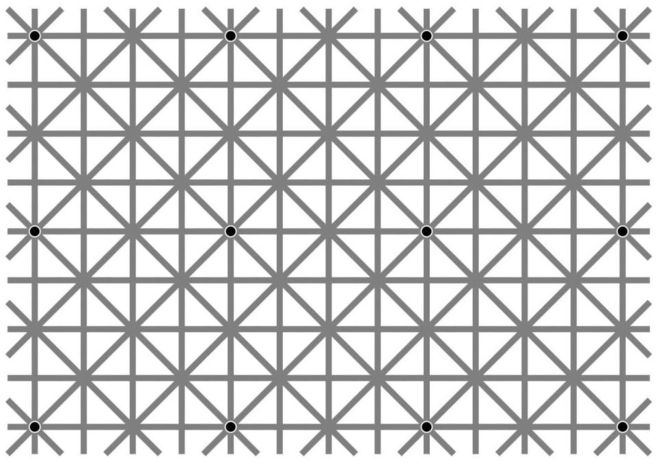 Llamada la ilusión de Ninio, por el científico francés Jacques Ninio, la imagen muestra una cuadrícula de líneas horizontales, verticales y diagonales con 12 puntos en algunas intersecciones.
