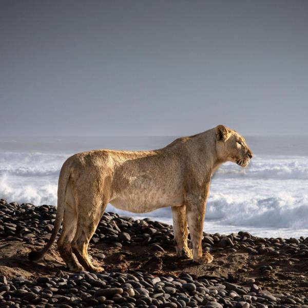 Es una foto impactante: una leona en una playa de piedras de Namibia mira a lo lejos mientras las olas tempestuosas rompen en el fondo. Ella vigila a su presa, los restos de un lobo marino del Cabo, que está fuera del campo de visión.