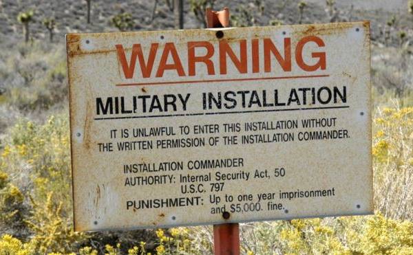 "Advertencia: instalación militar. Prohibida la entrada a personal no autorizado. Pena de hasta un año de cárcel y multa de US$5.000", se lee en uno de accesos a la base, que se encuentra oculta tras las montañas y situada junto al lecho del antiguo lago de Groom.