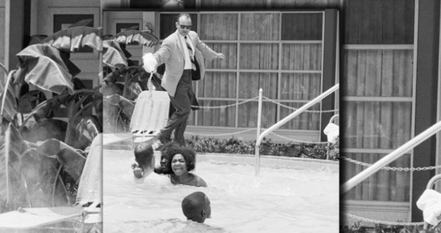 Enfurecido, el manager del motel, Jimmy Brock, agarró una botella de ácido clorhídrico, utilizado para limpiar baldosas, y empezó a rociar con él a los bañistas para que salieran del agua.